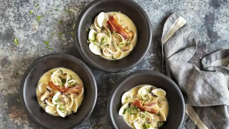 Almejas salteadas en cremosa salsa de nata y fumet con beicon crujiente