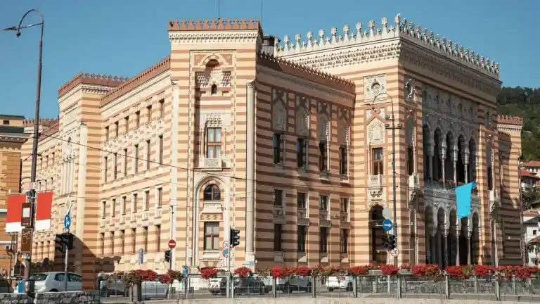 Este edificio es uno de los más curiosos de la capital de Bosnia y Herzegovina debido a su curiosa fachada inspirada en la joya nazarí y sucumbió al fuego.