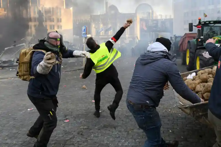 Miles de granjeros bloquean el centro de Bruselas con sus tractores mientras el Parlamento europeo acoge a los líderes de los Veintisiete